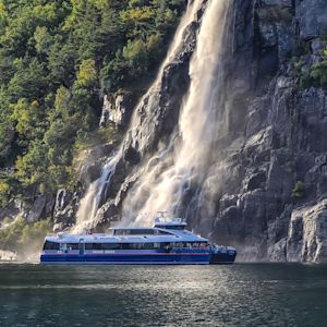 On the way to Preikestolen (Pulpit Rock), stop to feed goats grazing on the mountainside. With luck, you might even see a seal basking in the sun on the rocky shore. Then see Fantahålå (Vagabond’s Cave) where the “vagrants” hid from the sheriff in the old days. Shortly afterward, see the magnificent Preikestolen, 604 metres above the boat, a little while before you hike up to enjoy the view from the top. Then continue to the mighty Hengjanefossen waterfall where the crew steers the boat so close to the towering falls that you might feel its refreshing spray on your face!