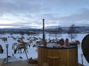 After the dog sledding adventure, you will be served a hot meal in a traditional North Norwegian setting around the open fire in a reindeer herder’s tent. After relaxing and warming up, you will continue on to tonight's accommodation, the Reindeer Ranch Glass Igloos.