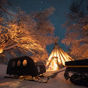 Get ready for a Northern Lights and Winter extravaganza in this cozy, family run glass igloo resort near Ivalo, Finland. Your glass igloo is set alone in the woods - you can gaze up at the Arctic stars and hopefully the Northern Lights will dance above you.
