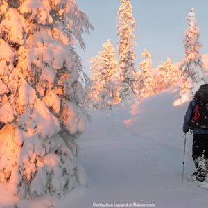 Explore the wonder of nature on a snowshoe trek. This trip takes us back in time as we venture to Äkäsmylly, a historic mill surrounded by Lapland's wilderness. This ancient site holds a special place in the region's history, serving as a spot for fishing and a resting place for travellers throughout the ages. As we linger at historic Äkäsmylly and breathe in the pure air we're reminded of the connection between humanity and the natural world. During our adventure, we will take a break to savour flavours of Lapland.