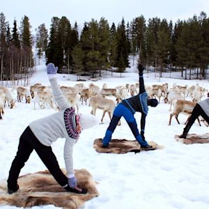 Start your day with breakfast before heading to a local reindeer farm for a truly unique yoga session—practicing among the reindeer! After a hearty farm lunch, we’ll stop in Ruka for an hour of shopping or strolling. Spend your afternoon how you like: snowshoe, ski, relax, or perhaps try a playful trapeze yoga session. Wind down with a gentle evening yoga class followed by a nourishing dinner. If the auroras appear, we’ll be ready to chase them.