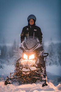 The Safari guide will teach you how to handle snowmobiles and about security matters and the rules of the safari. When two people are sharing a snowmobile, they can take turns in driving. You will get full safari equipment for the duration of the program: thermal outfit, socks and boots, gloves, balaclava and helmet.